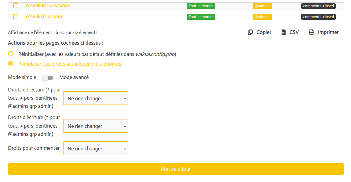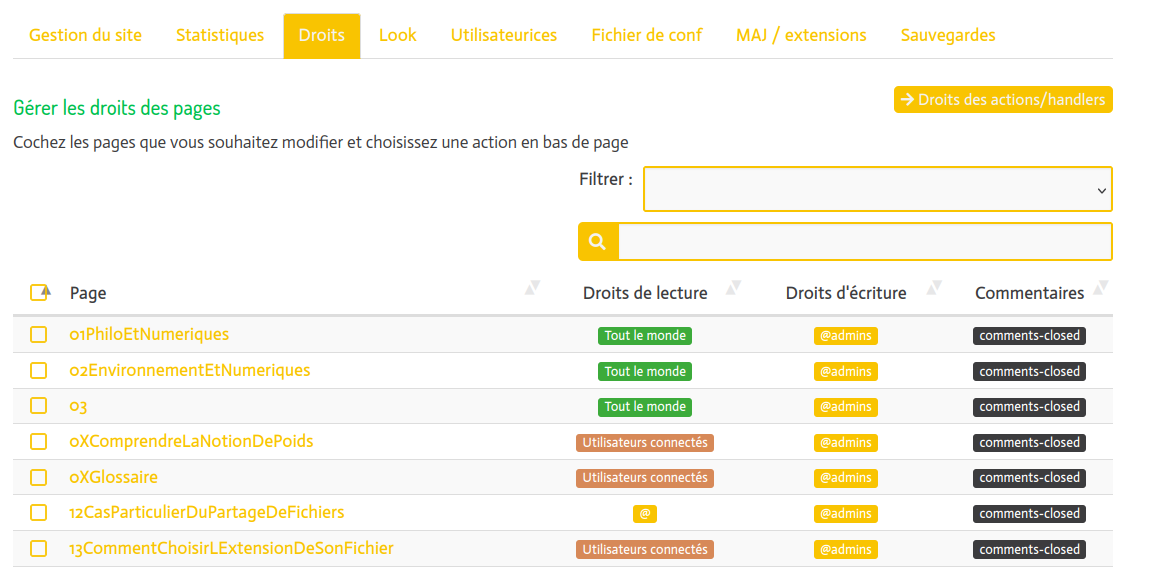 Il y a une liste des pages sous forme de tableau. A droite on peu voir les droits de lectures et d’écriture. Si on une ou plusieurs cases on peut modifier ces droits pour plusieurs pages.